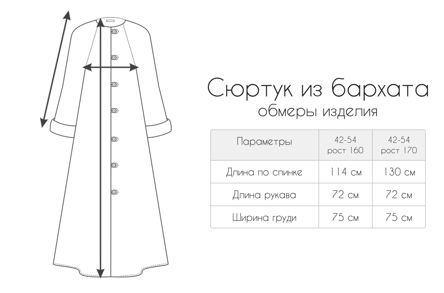 Лёгкое пальто для тёплой осени, выполненное из бархатной ткани расклёшенного силуэта на основе ластовичного кроя. Изделие полностью на подкладке из вискозы, в боковых швах предусмотрены удобные карманы. Рукава-реглан полной длины можно укоротить, подвернув манжету. Пуговицы обтянуты основной тканью, что придаёт модели цельность. Благородный бархатный блеск делает сюртук особенным и элегантным.